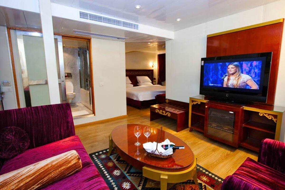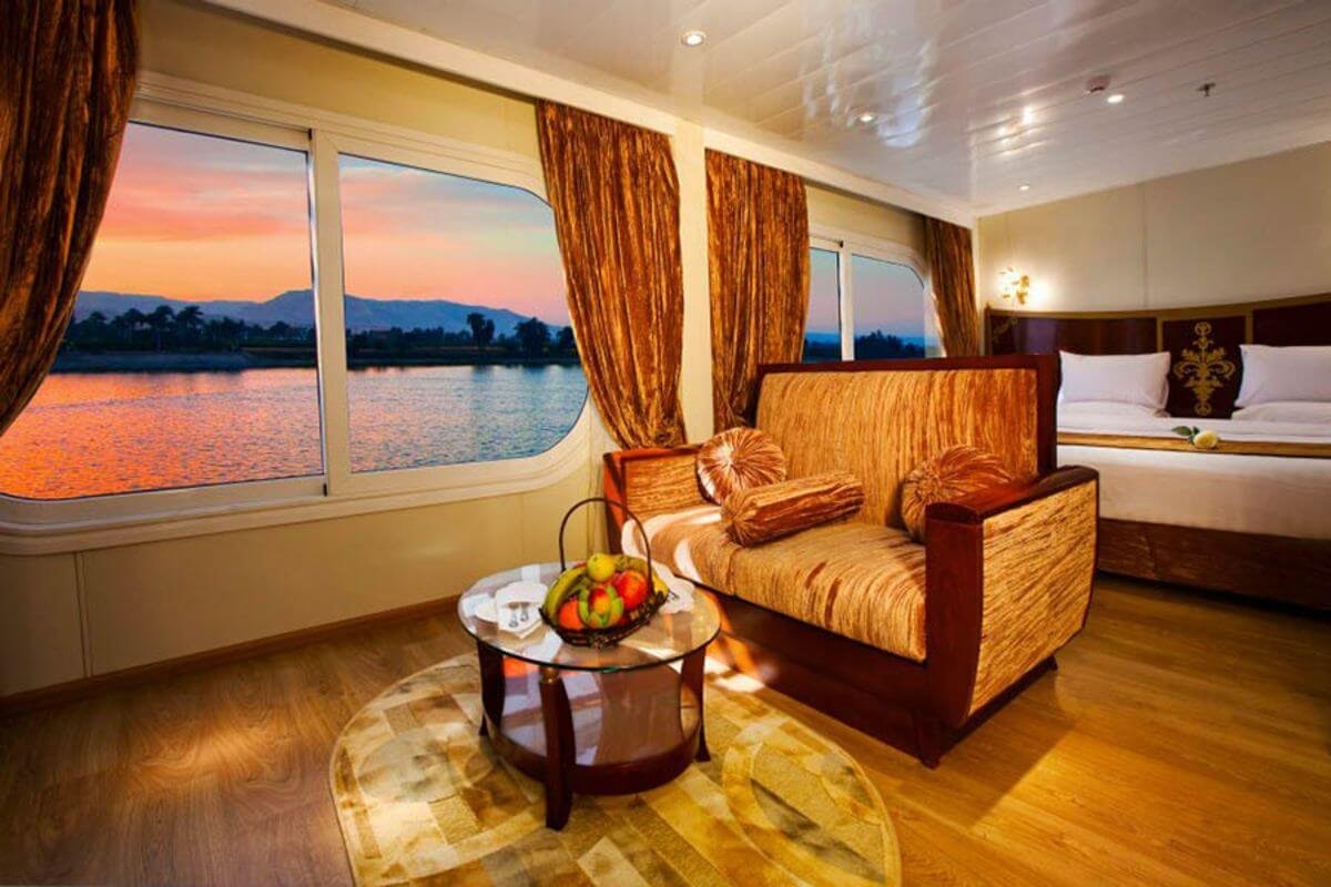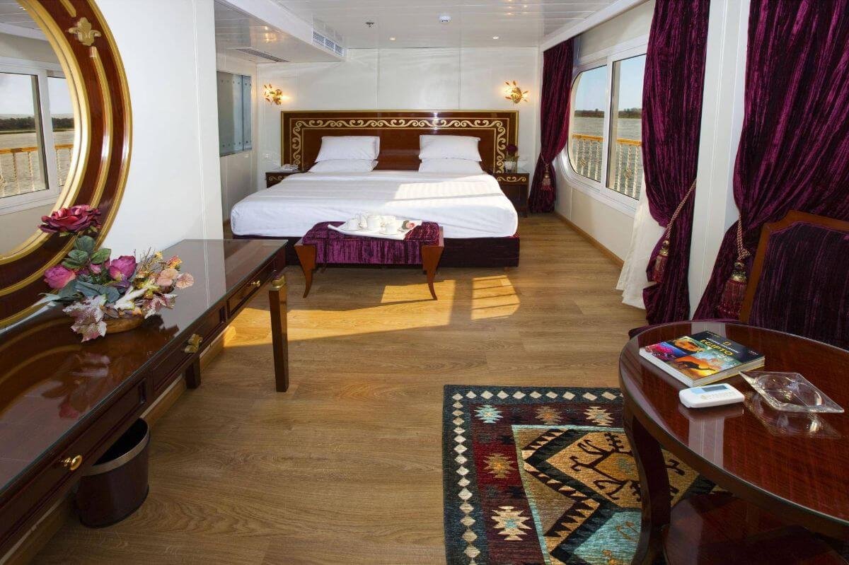 The Al Hambra Nile Cruise offers a refined and luxurious experience on the iconic Nile River. This 5-star cruise features a blend of traditional Egyptian charm and modern comfort, ensuring an unforgettable journey through Egyptβs most historic landmarks.The ship is designed with elegance and comfort in mind, featuring spacious cabins with large windows that offer stunning views of the Nile. Guests can enjoy the cruiseβs modern amenities, including a sun deck with loungers, a swimming pool, and a bar area, making it a perfect place to relax and enjoy the riverβs beauty.